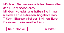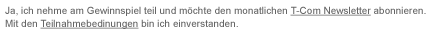 | Alle im Rahmen der Newsletter-Anmeldung abgefragten personenbezogenen Daten werden ausschließlich durch die Deutsche Telekom AG, T-Com genutzt. Eine Datenweitergabe an Dritte geschieht zu keinem Zeitpunkt. Sie können Ihr Newsletter-Abonnement jederzeit online ändern oder beenden. In jeder Newsletter-Ausgabe sind entsprechende Links enthalten. |